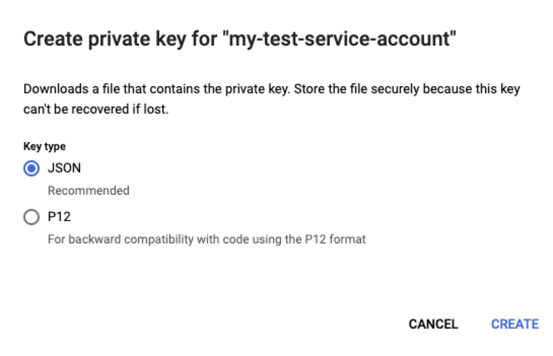 Go to the Add Key menu and click Create new key. Select JSON for the key type and click Create to generate a key and download a JSON file with the information required for the batch prediction job.