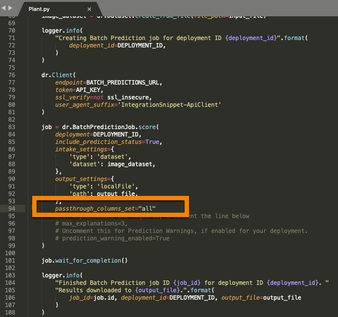 datarobot-predict.py). You can edit the script to incorporate additional steps. For example, add thepassthrough_columns_setargument toBatchPredictionJobif you would like to include columns from the input file (e.g.,image_id) to the output file.