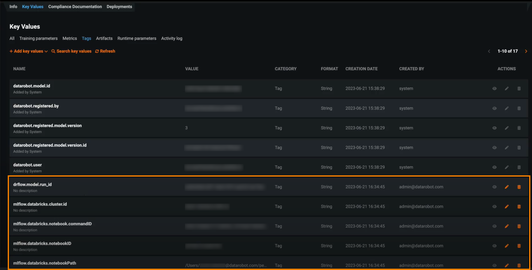 After you run this command successfully, you can see MLflow information on the Key Values tab of a Registered Model version: