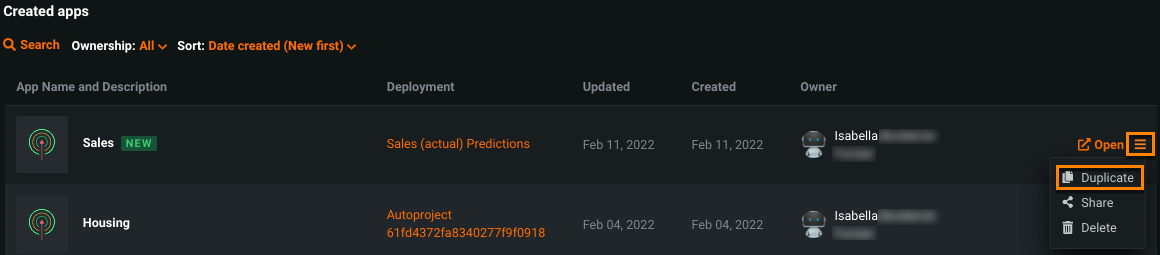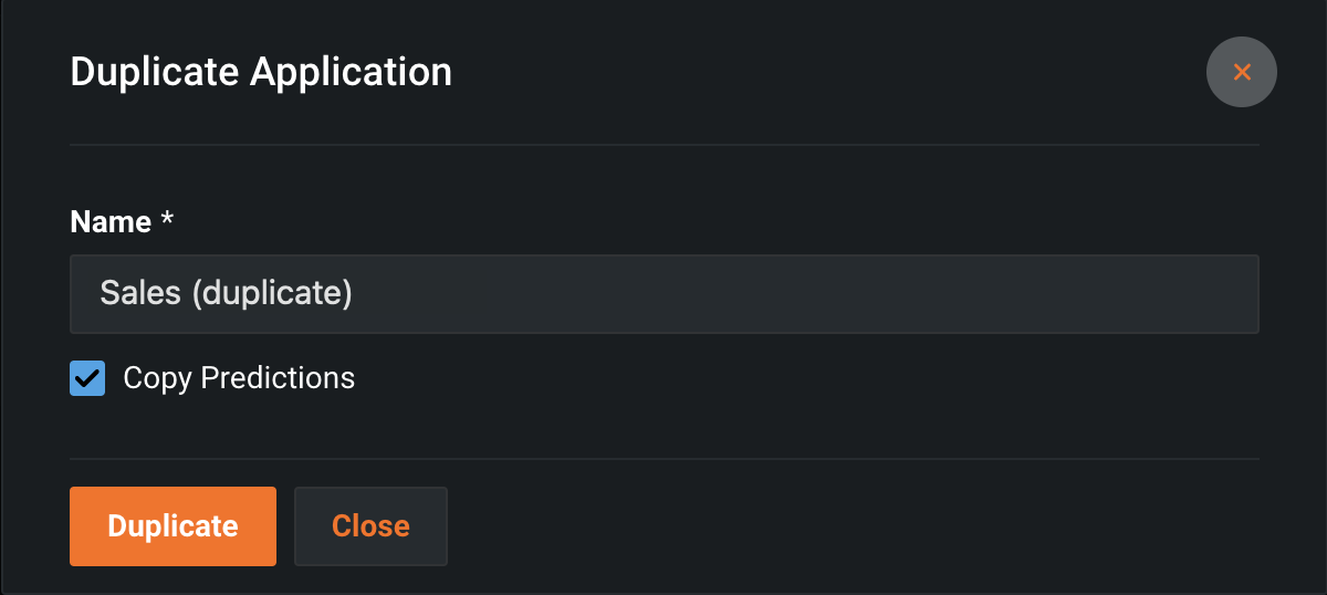 The duplicate functionality allows you to create a copy of an existing application along with any predictions made in it. This is useful if you want to share an application with another user, but don't want their changes to affect your application, or when creating multiple iterations of an application.