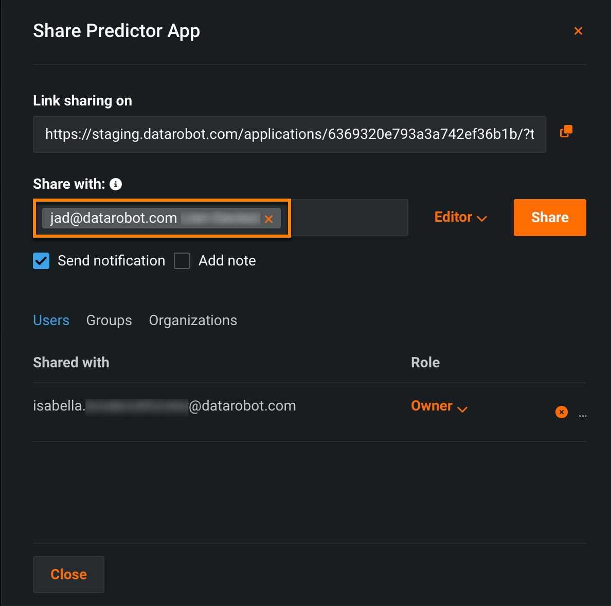This opens the Share dialog, which lists each associated user and their role. Editors can share an application with one or more users or groups, or the entire organization. Additionally, you can share an application with non-DataRobot users with a sharing link.