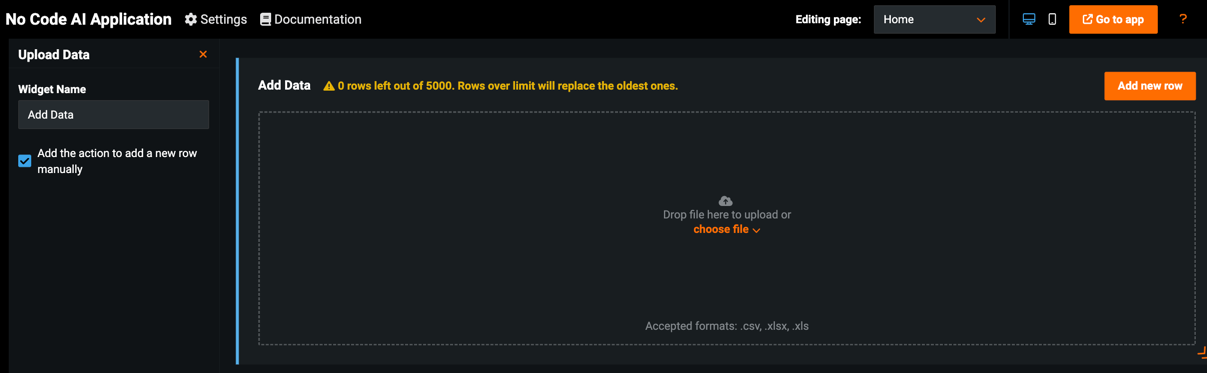 | Add New Row | Create Prediction | Allows you to make single record predictions. |