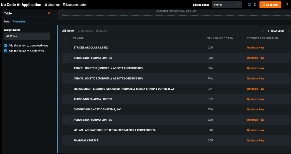 Home is the application landing page—the first page users see when opening an application. This is where you can upload batch prediction files as well as view prediction rows from batch predictions and single record predictions.