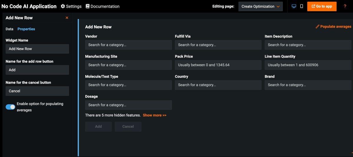 The Create Prediction page, or Create Optimization if you selected the Optimizer template, is where you make single record predictions using any features in the Add New Row widget.