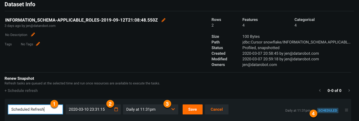 Field Description Name (1) Enter a name for the refresh job (or leave the default). Calendar picker(2) Sets the basis for the interval setting. Interval (3) Based on the calendar setting, the interval dropdown sets the frequency to daily, weekly, monthly, or annually. The time on the selected day is always set to the timestamp when the job was scheduled. Summary (4) Provides a summary of the selected scheduled task, including the interval and whether it is active or paused, supplied by DataRobot and updated with any changes to the job. -