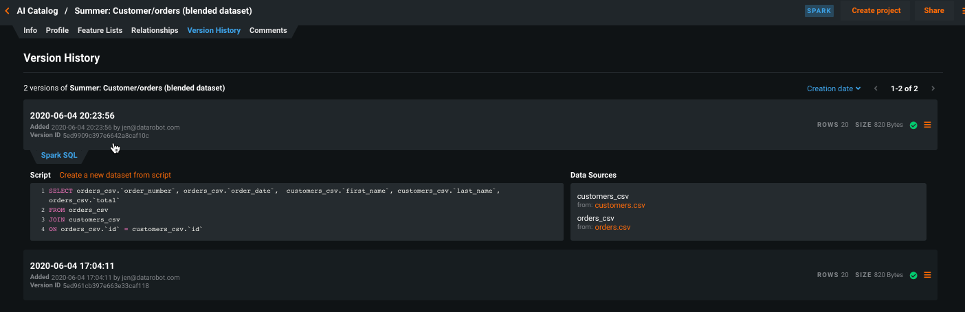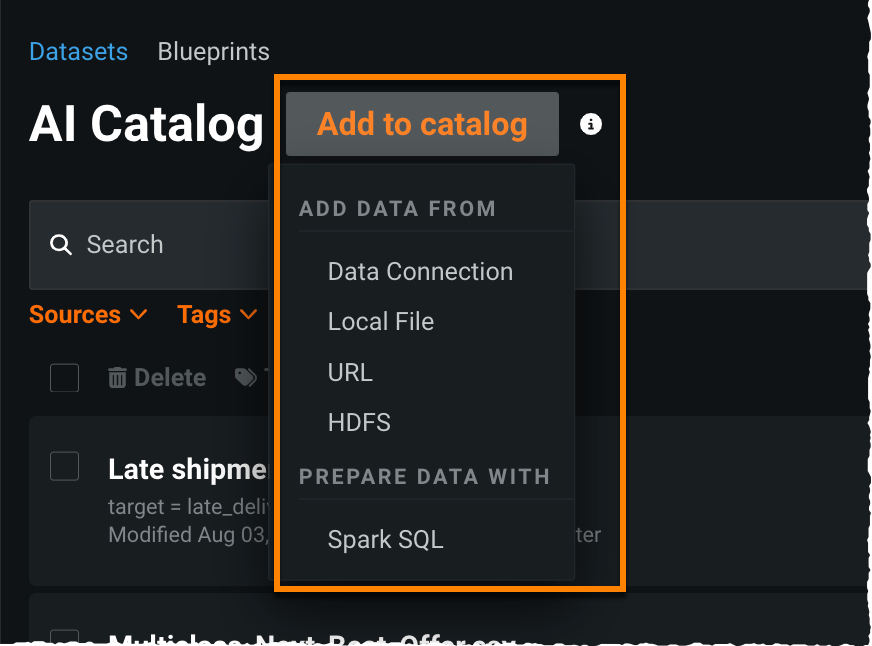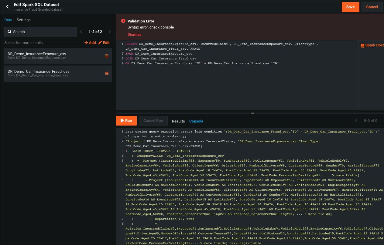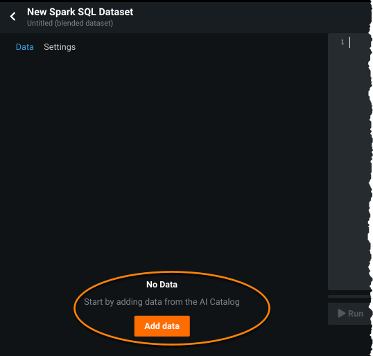 Using Prepare data with Spark SQL from the Add menu in the AI Catalog allows you to enrich, transform, shape, and blend datasets together using Spark SQL queries.
