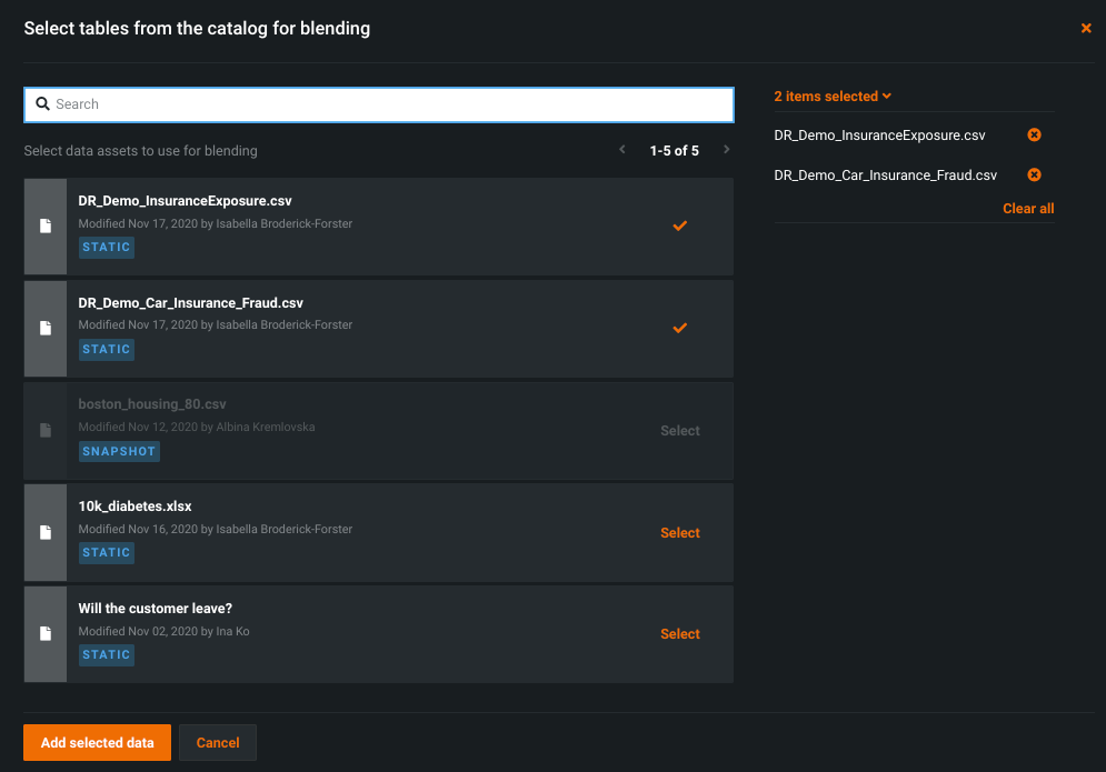 DataRobot opens available datasets in a new modal. Click Select next to one or more datasets from the list of assets. The right panel lists the selected datasets.