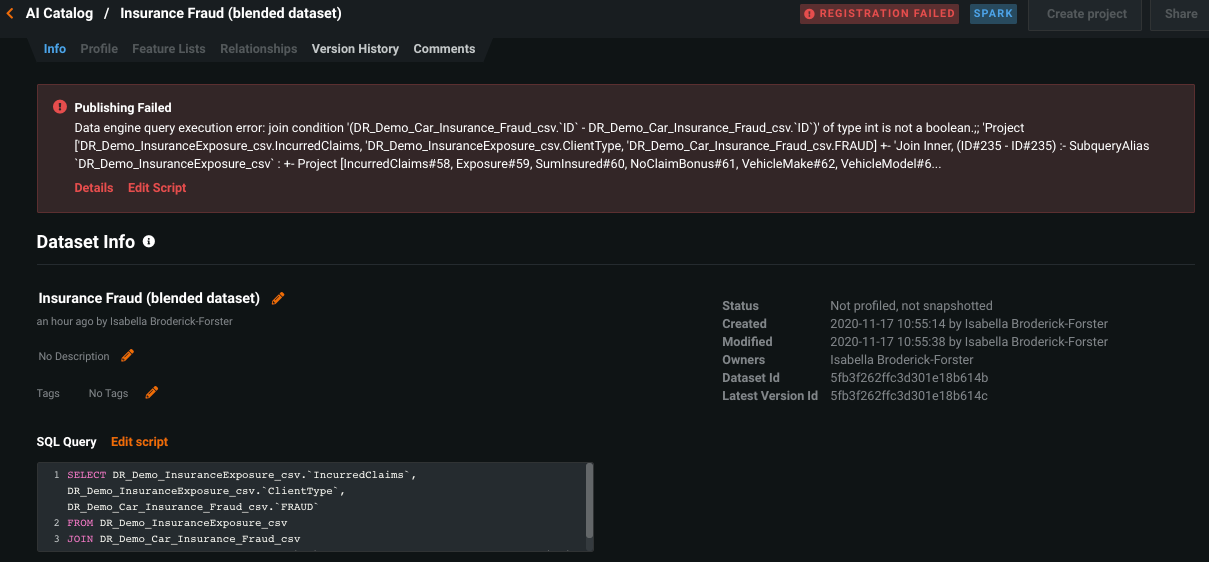If registration fails using the new query, use the Edit script link to return to the SQL editor, correct any problems, and save as a new version.
