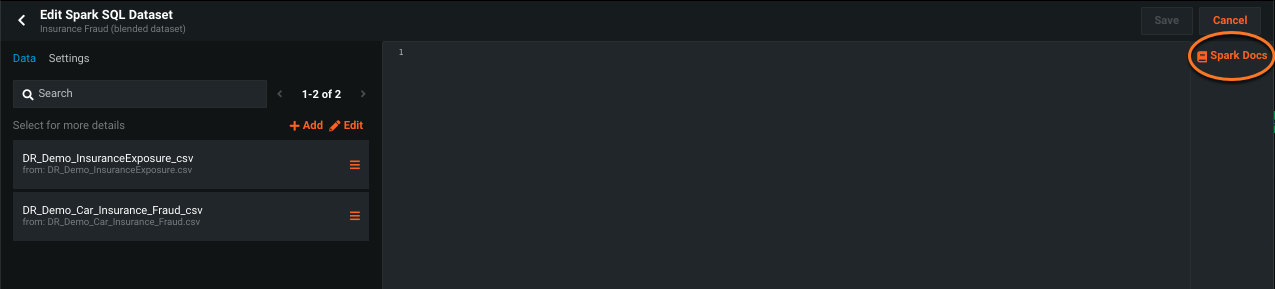 Once you have datasets loaded, the next step is to enter a valid Spark SQL query in the SQL input section. To access the Spark SQL documentation in DataRobot, click Spark Docs.