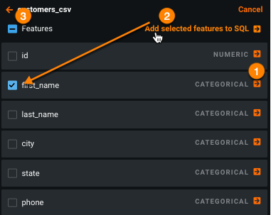 - add a group of features by first selecting them in the checkbox to the left of the feature name and then choosing Add selected features to SQL (2).