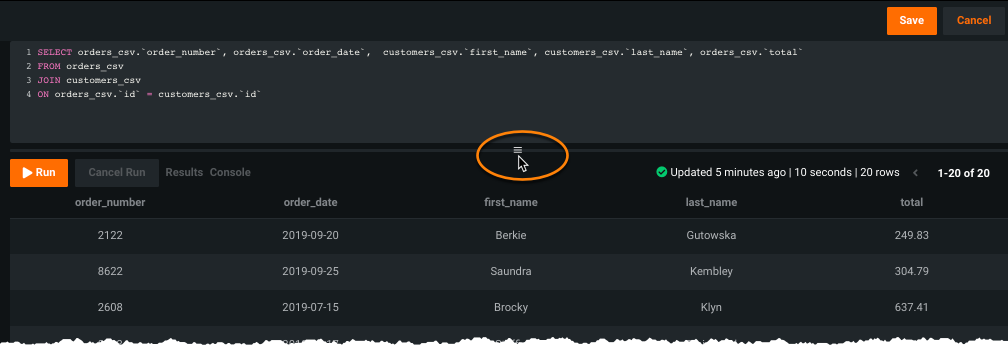 When the query is complete, click Run or if there are several queries in the editor, highlight a specific section and then click Run . After computing completes, if successful, DataRobot opens the Results tab. Use the window-shade scroll to display more rows in the preview; if necessary, use the horizontal scroll bar to scroll through all columns of a row: