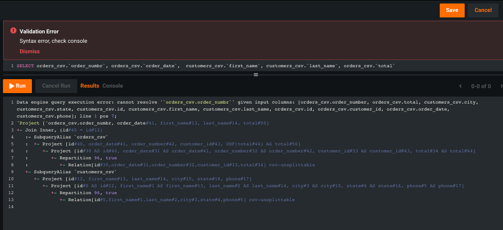 Once you have saved your data asset, you can both view and edit the query from the asset's Info tab. Any errors from your previous run are displayed at the top of the page.