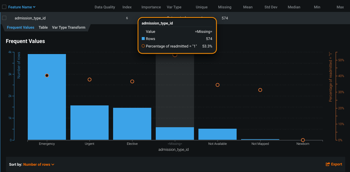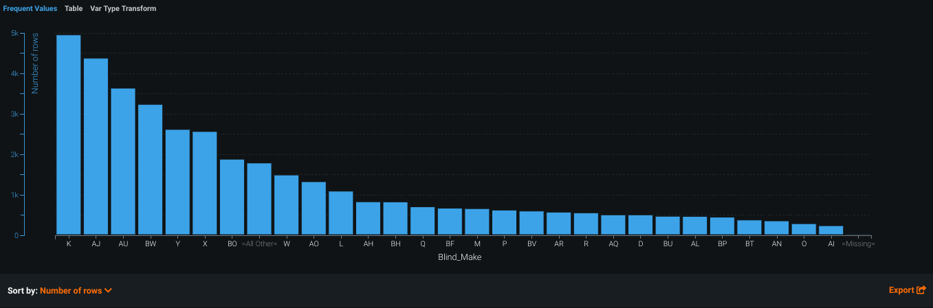 In many cases, you can change the display using the Sort by dropdown. By default, DataRobot sorts by frequency (Number of rows), from highest to lowest. You can also sort by <feature_name>, which displays either alphabetically or, in the case of numerics, from low to high. The Export link allows you to download an image of the Frequent Values chart as a PNG file.