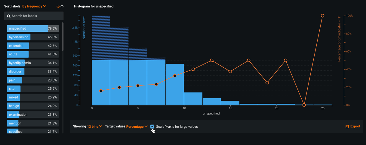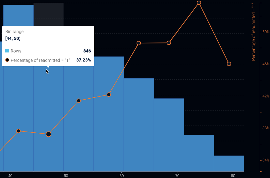 In this example, there are 846 people who had between 44-49.999999 lab procedures. The average target value represented by the circle (in this case, the percent readmitted) is 37.23%. (The orange dots correspond to the right axis of the histogram.)