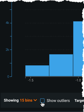 Check the Show outliers box and to initiate a calculation identifying the rows containing outliers. DataRobot then re-displays the histogram with outliers included: