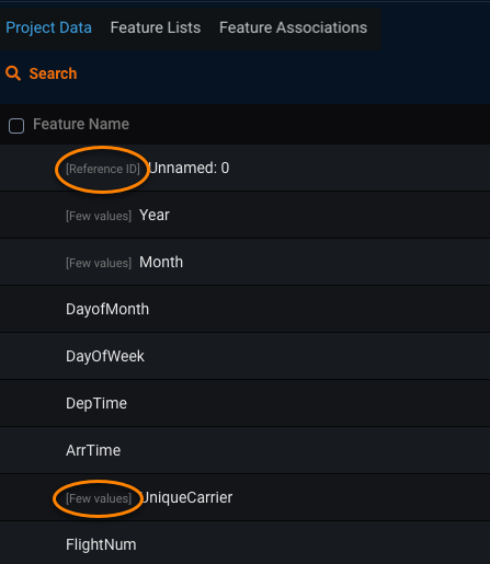 The Data page displays tags to indicate a variety of information that DataRobot uncovered while computing EDA1. You can also click a feature name to view its details.