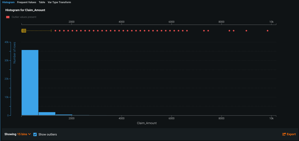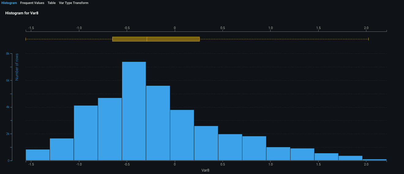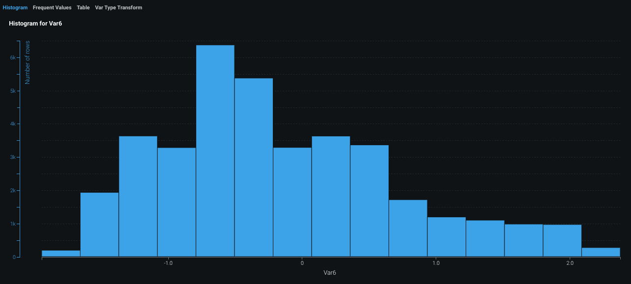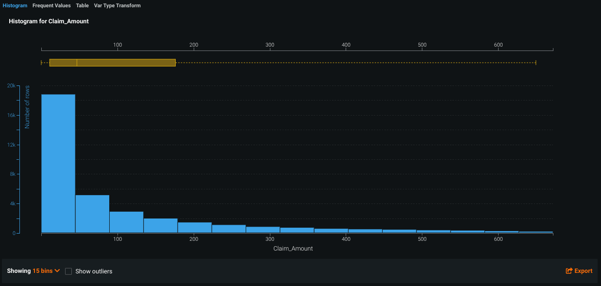 The Histogram chart is the default display for numeric features. It "buckets" numeric feature values into equal-sized ranges to show frequency distribution of the variable—the target observation (left Y-axis) plotted against the frequency of the value (X-axis). The height of each bar represents the number of rows with values in that range.
