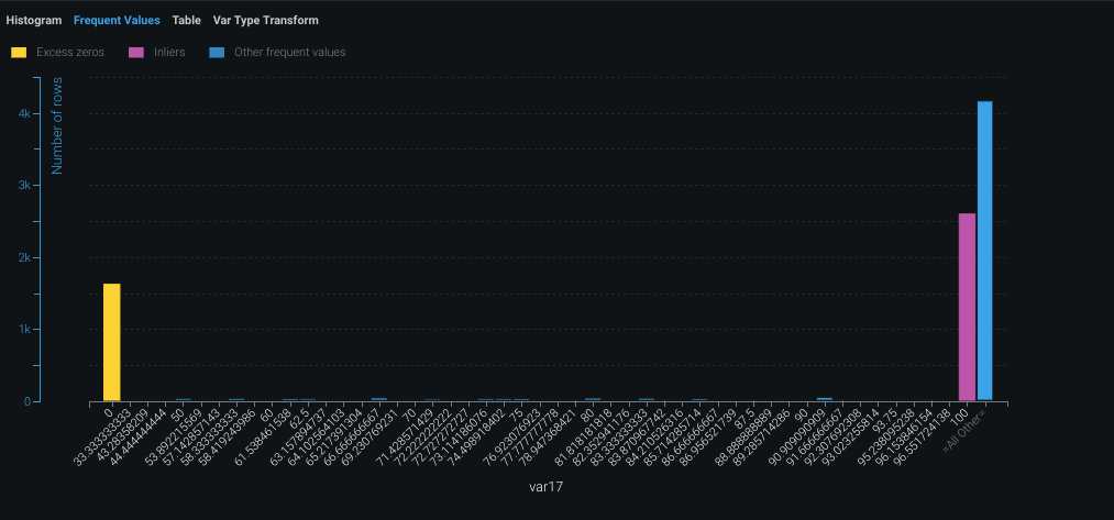 The Frequent Values chart, in addition to showing common values, reports inliers, disguised missing values, and excess zeros.