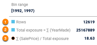 - The sum of exposure (2) in each bin. That is, the sum of the weights for all rows weighted by exposure.