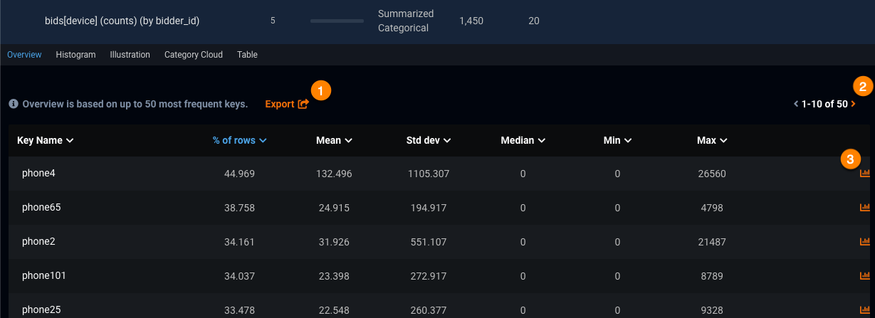 The Overview tab presents the top 50 most frequent keys for your feature. Each key displays the percentage of rows that it appears in, its mean, standard deviation, median, min, and max. You can sort the keys by any of these fields. Most of this information is available for other types of features in the columns on the Data page, but for summarized categorical features each individual key has its own values for these fields.