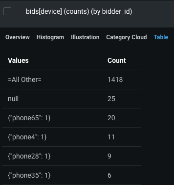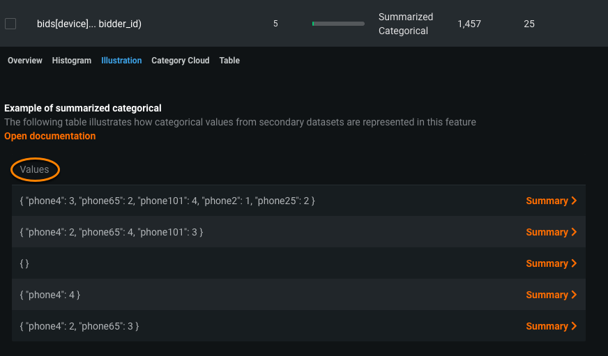 The Illustration tab shows how summarized categorical data is represented as a feature. For example, in the below image, the Values column contains five summarized categorical features displayed in JSON dictionary format (selected at random), as described above.