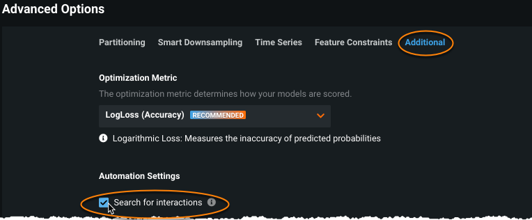 To enable interaction search for a primary dataset, after selecting a target, expand the Advanced options link and select the Additional tab. In the Automation Settings section, select Search for interactions: