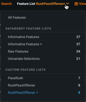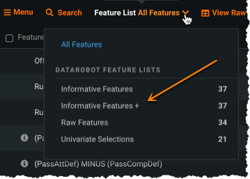 DataRobot creates new feature lists—"Informative Features" and, if applicable, custom lists—with the created features and marks the lists with a plus (+) sign. Informative features: