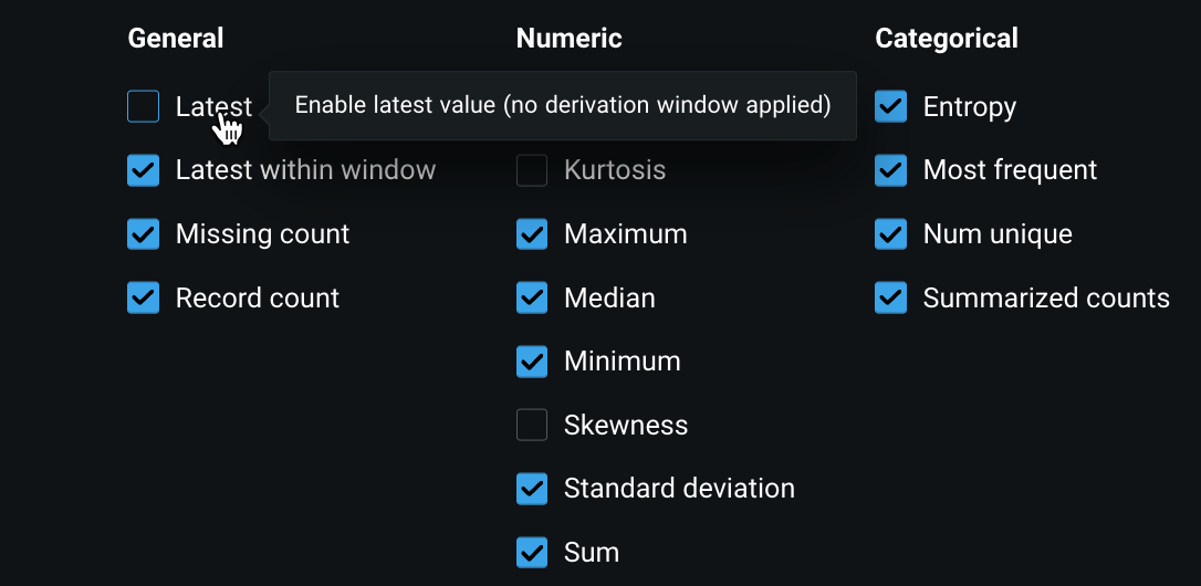 | Latest within window | Generates new features within the defined FDW. For time-aware feature engineering, only the data within the FDW is required when making predictions. | Enabled |