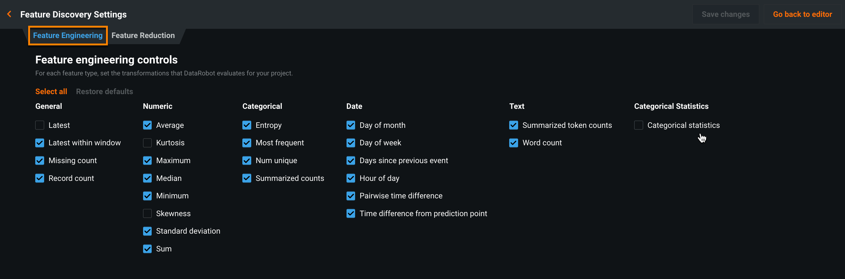 In Feature Discovery Settings, click the Feature Engineering tab. Consider which feature engineering transformations make the most sense for your project and select the ones you want DataRobot to try when deriving new features.