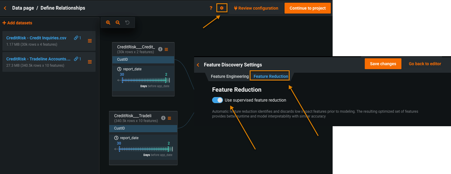 To access Feature Discovery Settings, click the settings gear on the Define Relationships page.