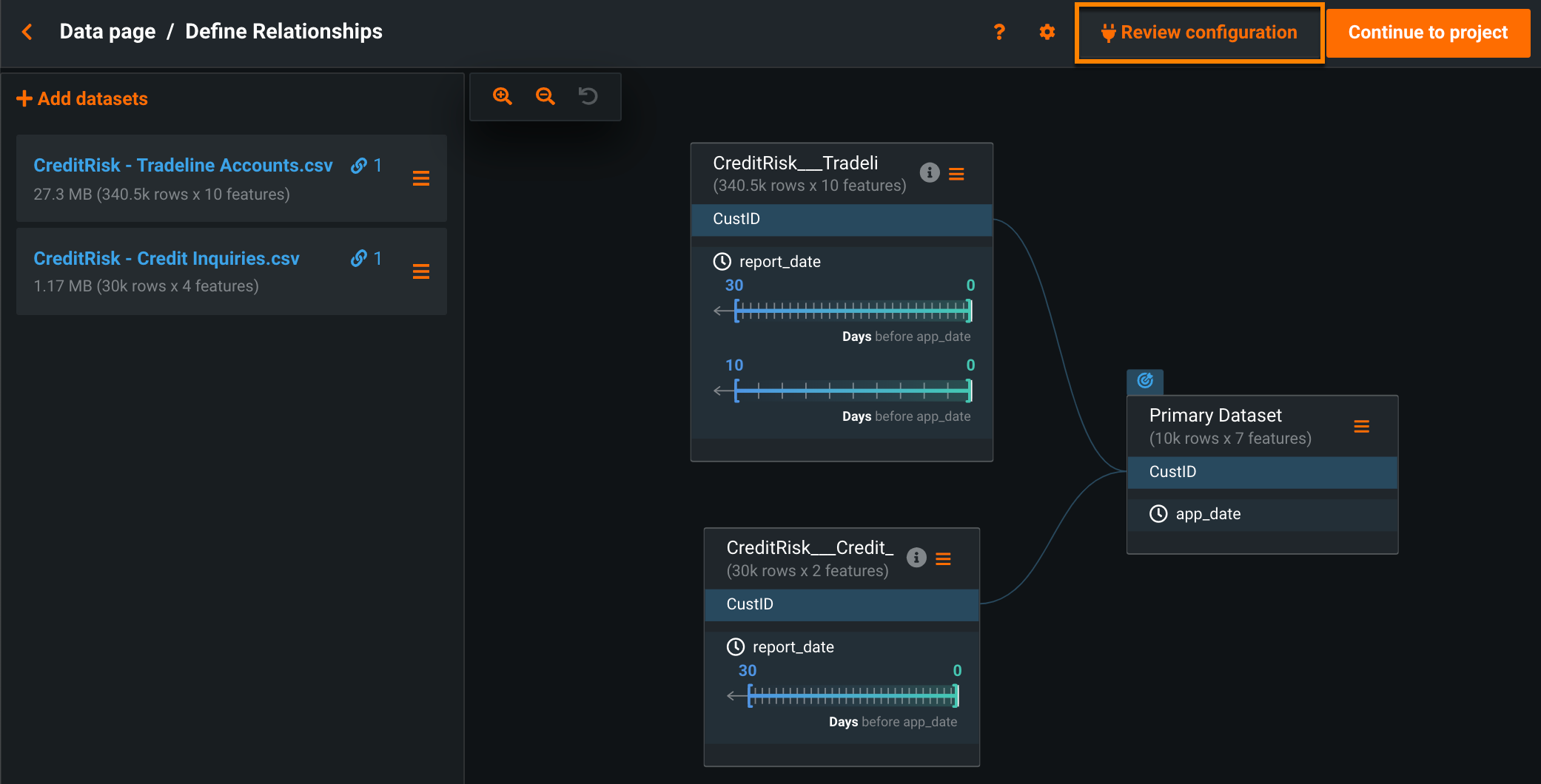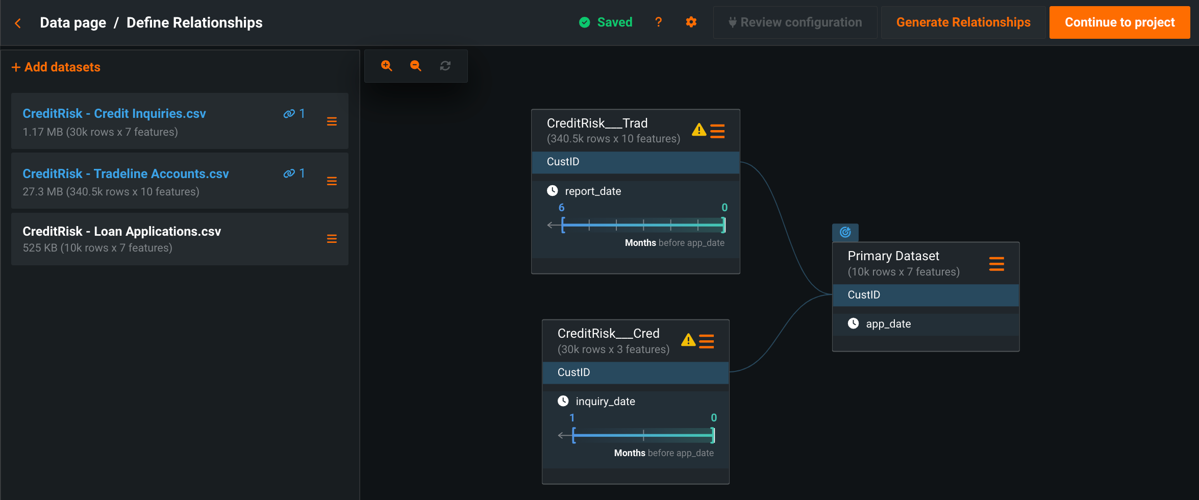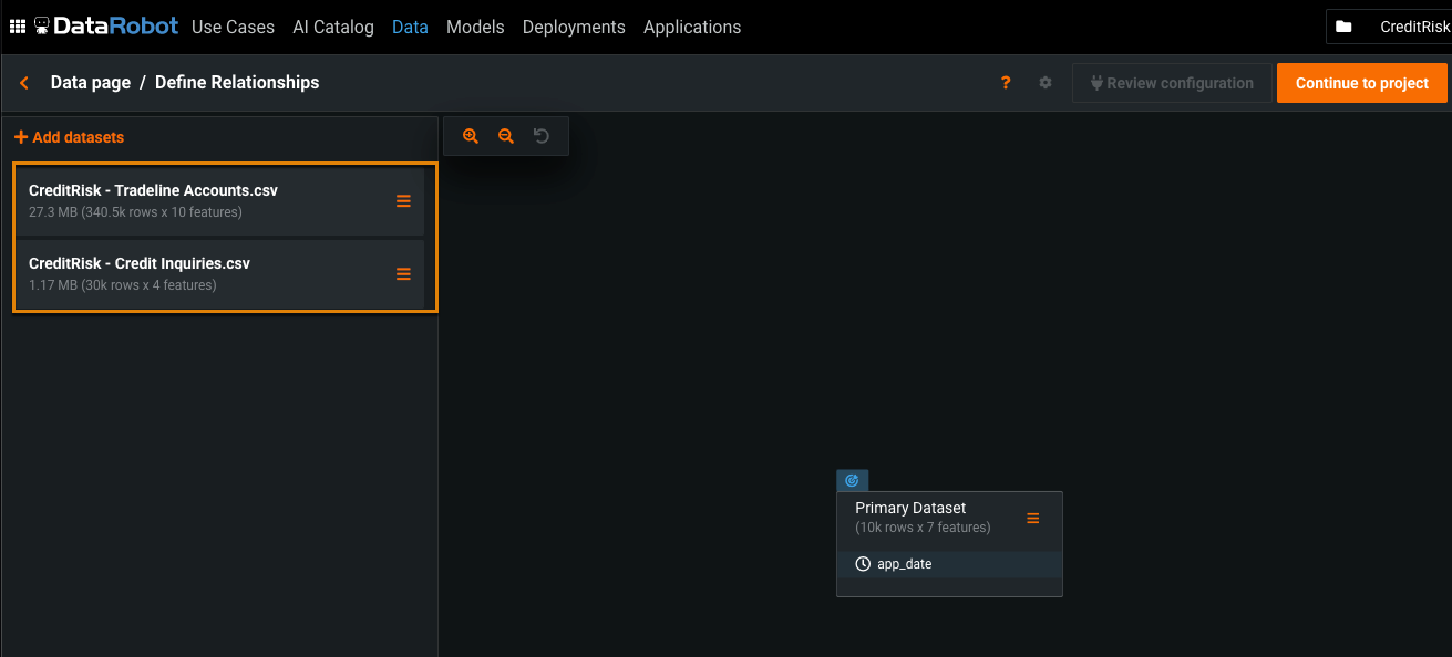 Two additional relational datasets, CreditRisk - Credit Inquiries and CreditRisk - Tradeline Acccounts, are the secondary datasets used for Feature Discovery.