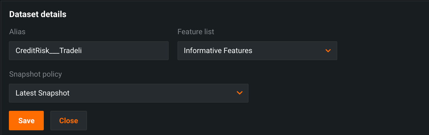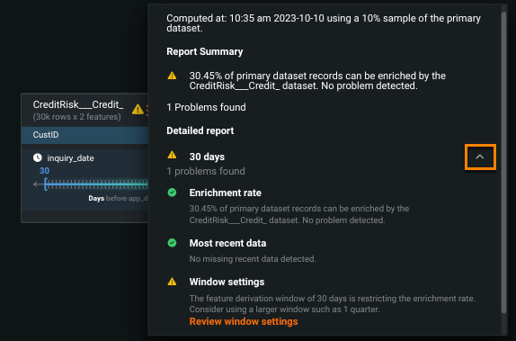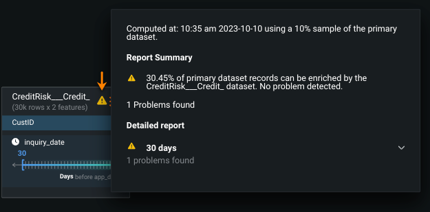 | Most recent data | Compares the minimum and maximum time index of the secondary and primary datasets to determine if the secondary dataset is outdated. | Review the selected feature list and snapshot policy. | Time-aware |