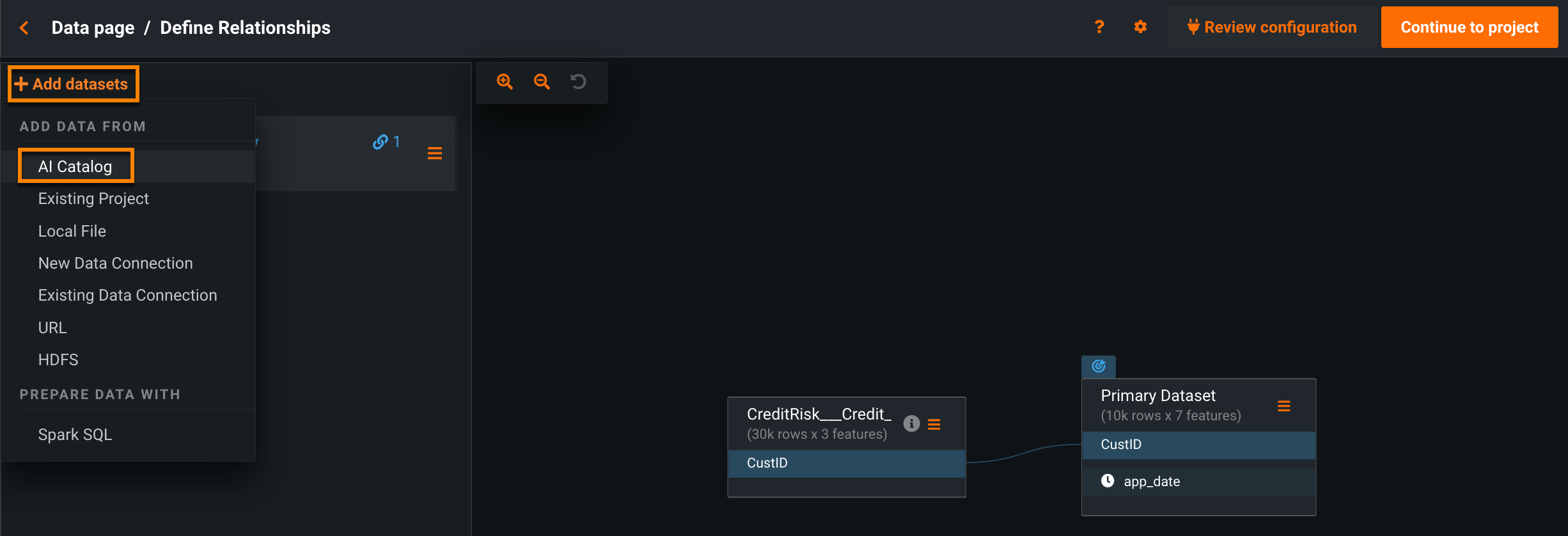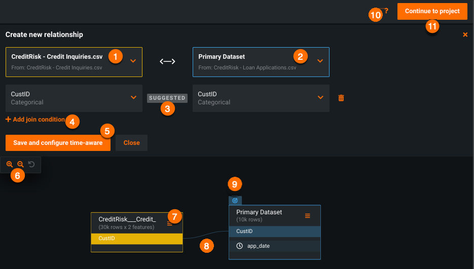 ) to delete the join.4 Add join condition Provides a manual join configuration option. 5 Save or Save and configure time-aware Saves the relationship configuration. Save is the option if there is no date feature or you did not set a prediction point. If you did set a prediction point from the primary dataset, the Save and configure time-aware button displays. 6 Canvas display controls Zooms in or out, or resets the default display size. 7 Dataset menu options Provides access to a variety of actions that can be enacted on a primary or secondary dataset. 8 Join edit launch Opens the relationship editor, allowing you to define or modify the relationship between the datasets joined by the line you clicked. 9 Primary icon Indicates, with a bullseye icon, that this is the primary dataset. 10 Tour launch Opens a short tour that provides an overview of configuring Feature Discovery. 11 Continue to project Returns to the Start screen where you can revise your time-aware settings, set advanced options, set a modeling mode, and start the modeling process.
