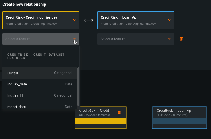 The following sections use an example to illustrate how DataRobot automatically discovers new features from multiple datasets to predict whether a loan will default. In the primary dataset, CreditRisk - Loan Applications, the is-bad column is the project target. The relation between the datasets is the CustID column.