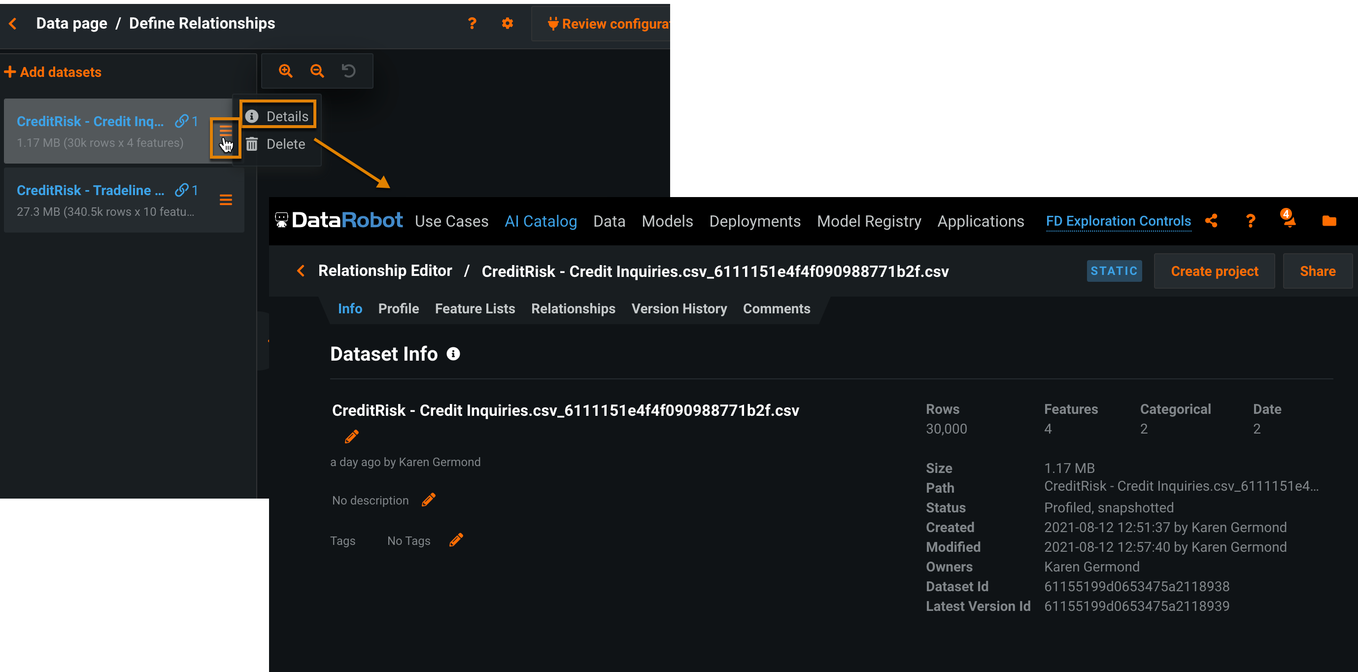 | Details | Click to open the Info window for the dataset in the AI Catalog. |
