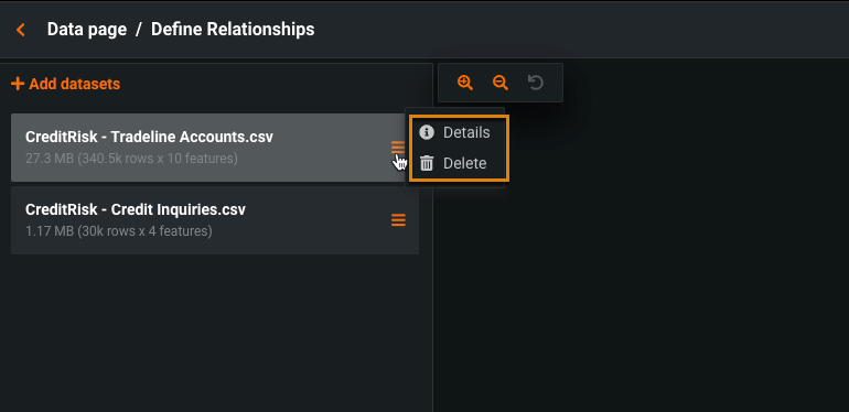 You can access dataset details directly from the relationship editor using one of the following methods: