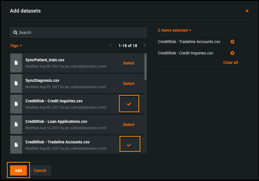 From the AI Catalog, select the datasets you want to include by clicking Select. Use the search functionality to easily locate datasets for selection. When finished, click Add.