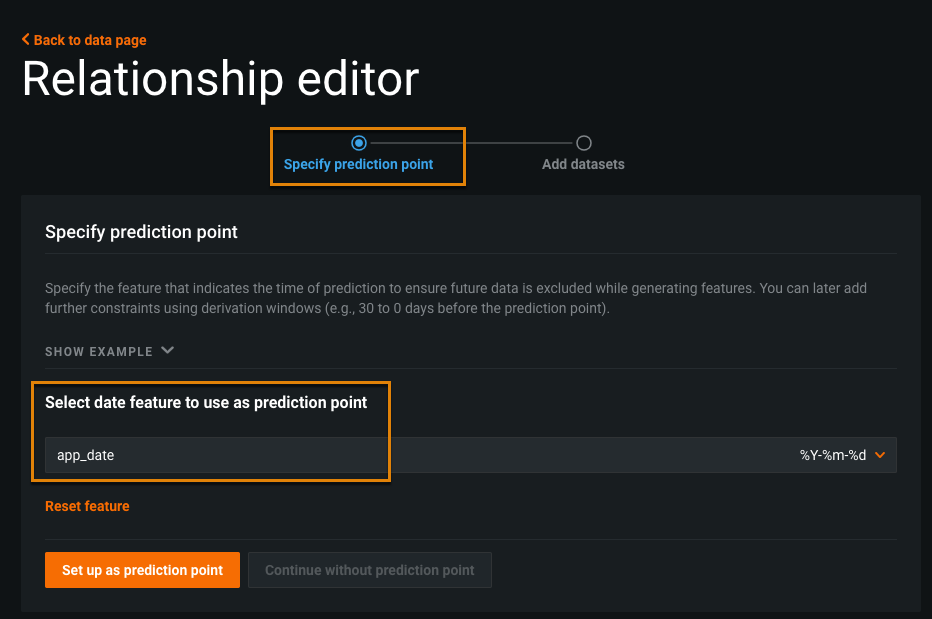 On the Specify prediction point page of the relationship editor, optionally Select a date feature to use as a prediction point. This date/time feature from the primary dataset serves as a reference date for feature derivation windows.