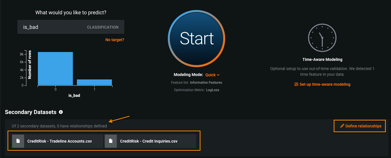 A valid Feature Discovery project requires at least one secondary dataset—the following tabs describe how to load additional datasets into the project from both the Start page and the relationship editor: