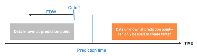 Once Feature Discovery applies prediction point rounding and the FDW end, DataRobot derives the final "cutoff" used for time-aware engineering. The cutoff point is the point at which DataRobot will not go forward when generating features. In other words, the FDW (the rolling window of past values) is comprised of the furthest time back and the nearest time, both modified by the rounding selection.