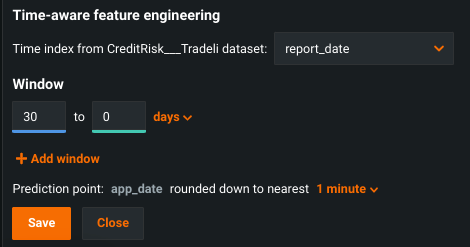 After a join is saved, if the added dataset has a date feature and if you set a prediction point, the Save and configure time-aware option becomes available. Click to open the Time-aware feature engineering editor.