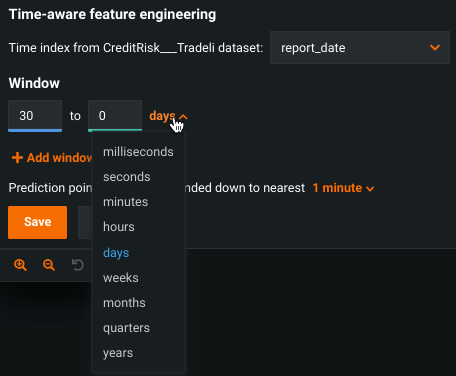 DataRobot also automatically calculates additional, smaller FDWs for the project, in addition to the window you specify. For example, if you set the FDW parameters to "30 to 0 Days," DataRobot selects additional candidate durations (perhaps 1 to 0 weeks, 1 to 0 days, and 6 to 0 hours) and derives features from those windows. The new candidate window sizes are based on an internal algorithm that: