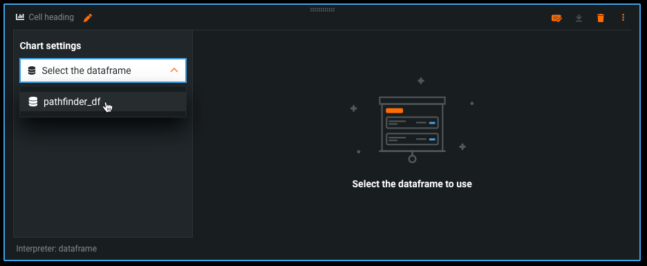 When you add a chart cell to a notebook, you first need to specify the data you want to visualize by selecting a DataFrame. Select the variable name corresponding to the DataFrame from the dropdown list in the chart cell. The cell lists all of the DataFrame objects that are currently in-memory.