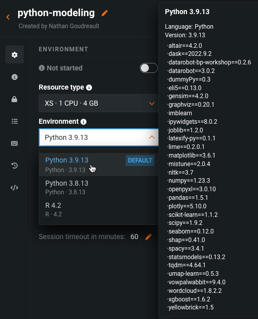 The default image for the notebooks is a pre-built Python image with all the dependencies and common open-source software (OSS) libraries preinstalled. To see the list of all packages available in the default image, hover over that image in the Environment tab: