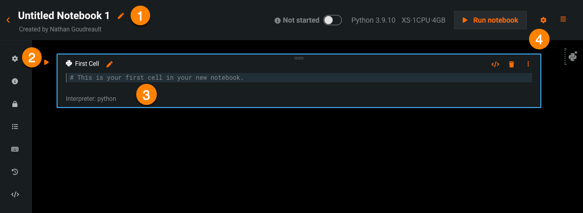 Element Description 1 Notebook name The name of the notebook displayed at the top of the page and in the dashboard. Click on the pencil icon
