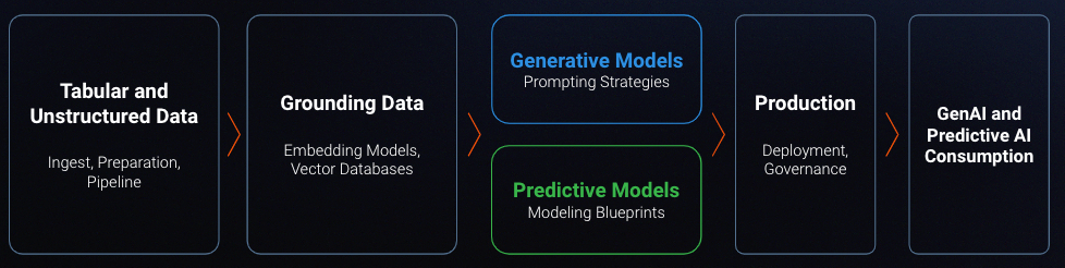 DataRobot's generative AI offering builds off of DataRobot's predictive AI experience to enable you to bring your favorite libraries, choose your LLMs, and integrate third-party tools. You can embed or deploy AI wherever it will drive value for your business, and leverage built-in governance for each asset in the pipeline.