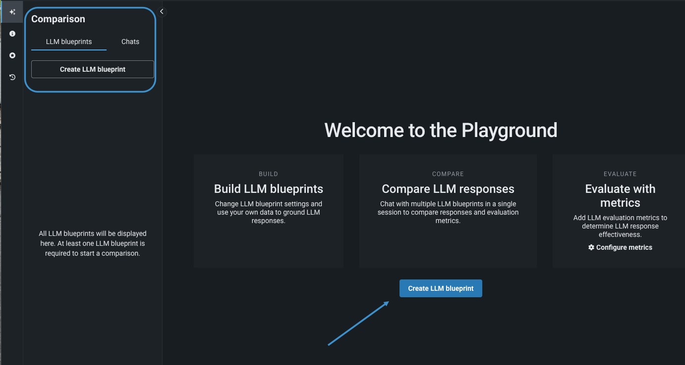 To create an LLM blueprint, select that action from either the Comparison panel or the playground welcome screen.