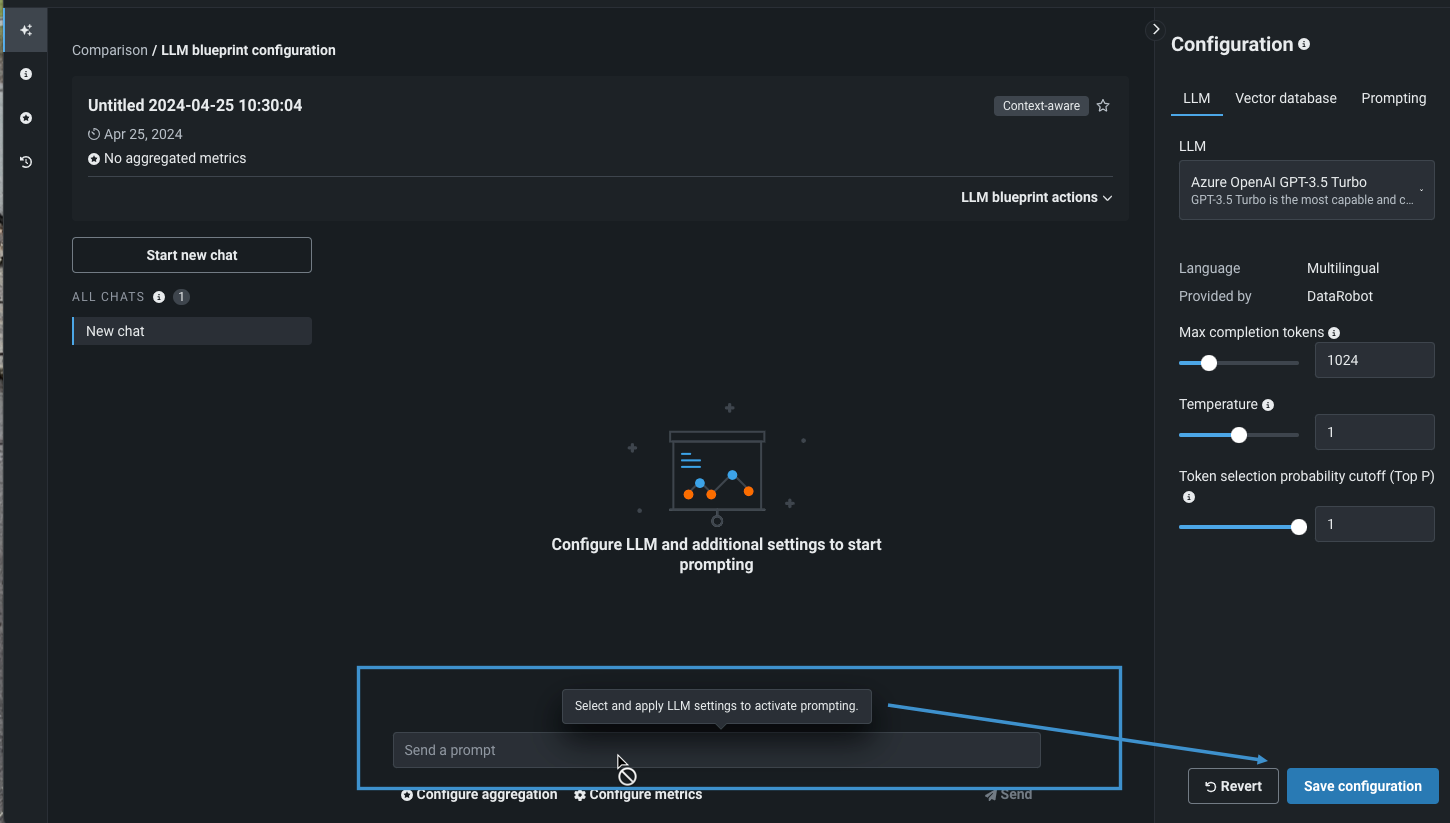 When you first configure an LLM blueprint, part of the creation process includes chatting. Set the configuration, and save, to activate chatting: