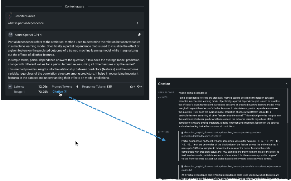A citation is a metric and is on by default (as are Latency, Prompt Tokens, and Response Tokens). Citations provide a list of the top reference document chunks, based on relevance to the prompt, retrieved from the vector database. Be aware that the embedding model used to create the vector database in the first place can affect the quality of the citations retrieved.