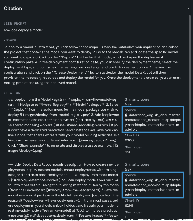 The following example, which uses the DataRobot documentation as the vector database, compares results to the same prompt ("how do I deploy a model?") with and without a metadata filter applied.